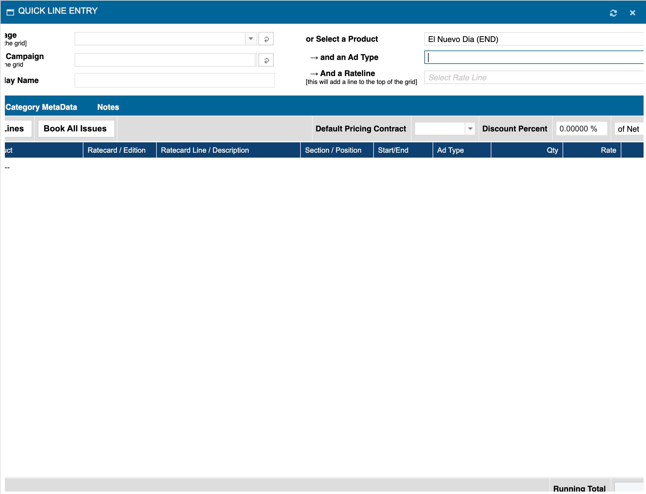 9. En Quick line entry, haga click sobre el campo de "Select a Product" y click sobre el producto deseado, en este ejemplo "El Nuevo Dia"