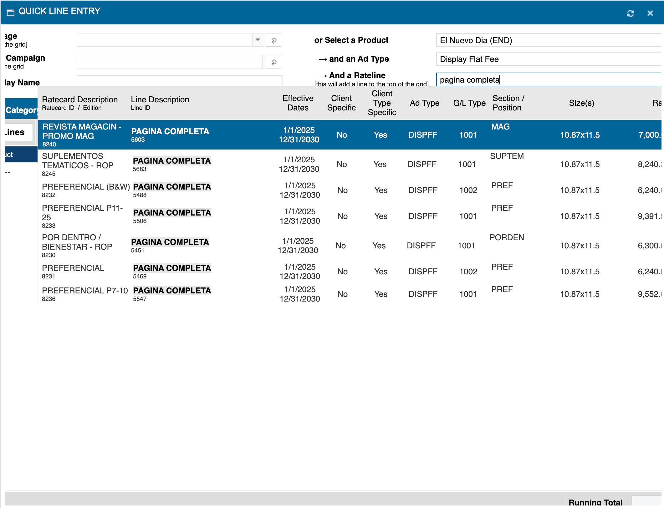 11. Seleccione el ratecard deseado en el campo de "Rateline"